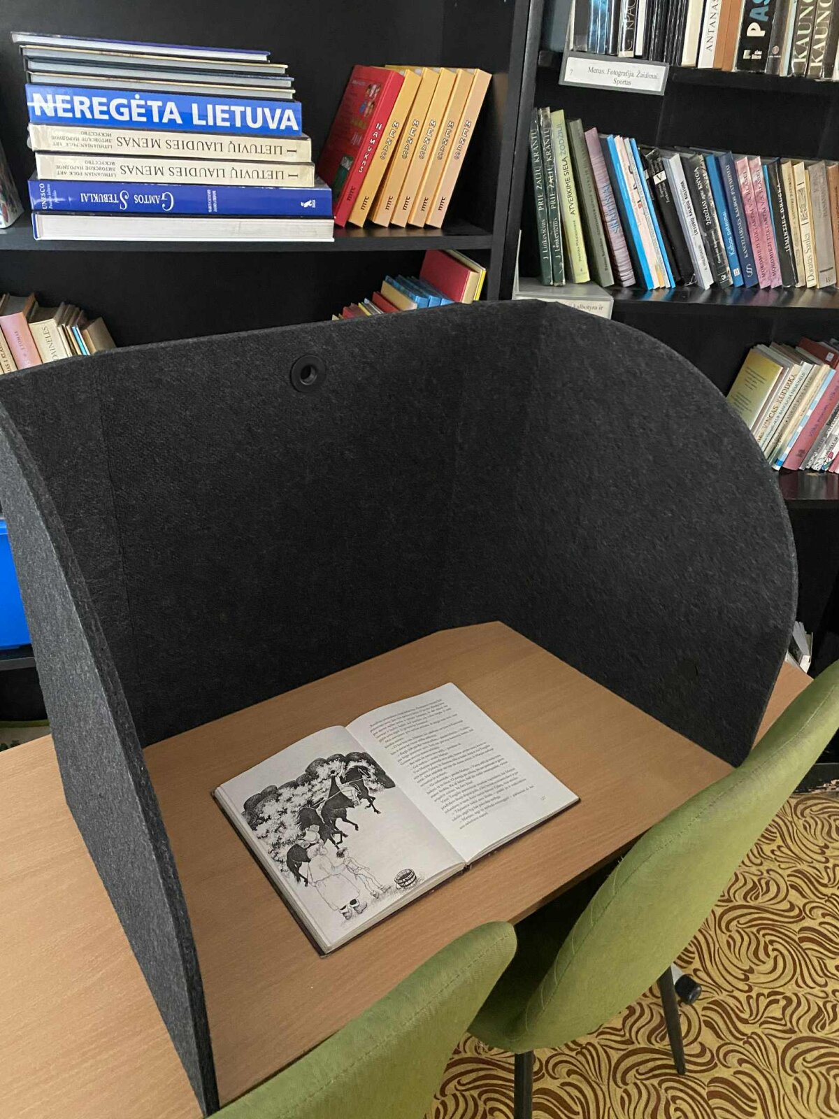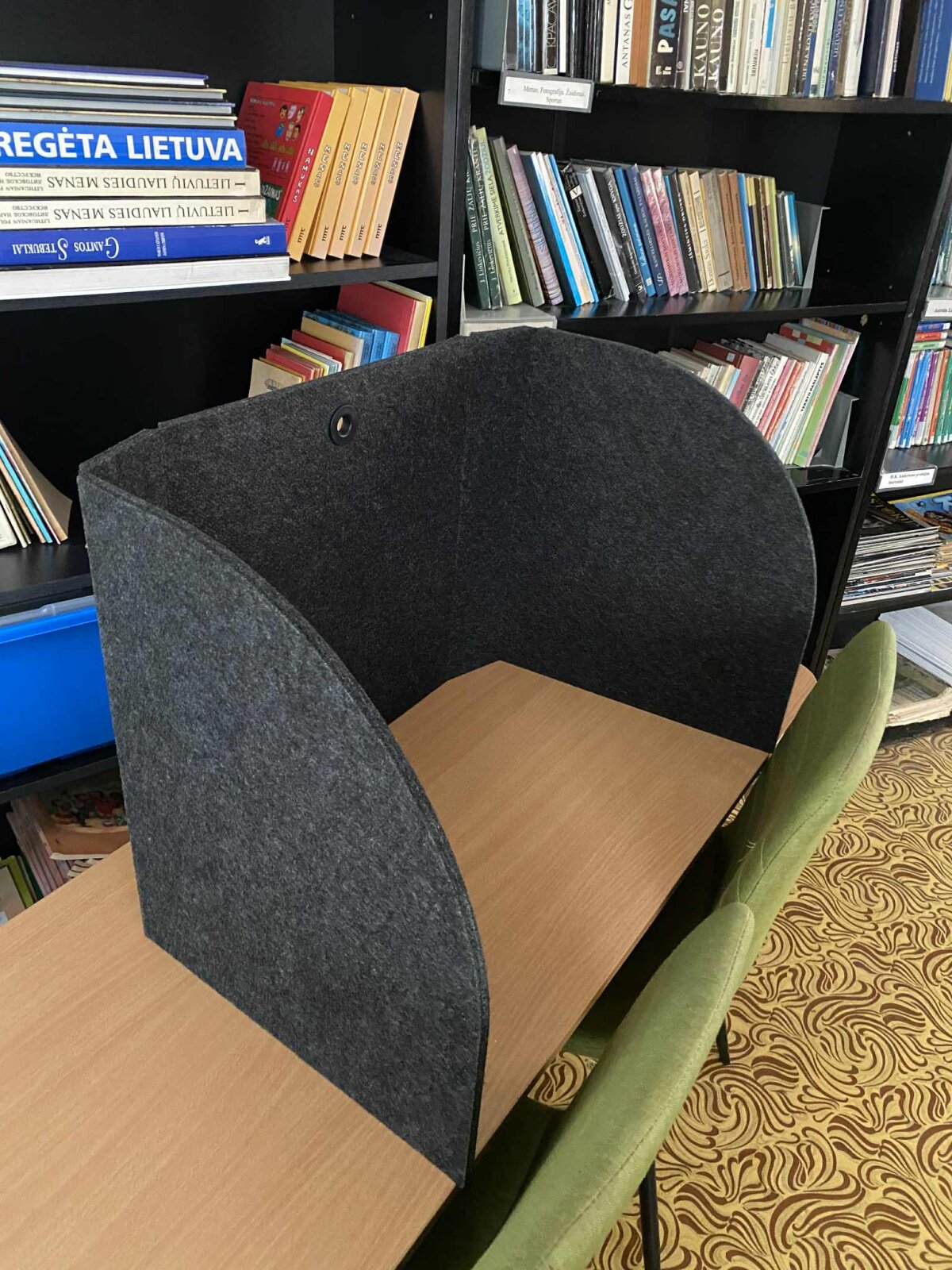 Mokyklos bibliotekoje įrengtos dvi akustinės transformuojamos stalo pertvaros, pritaikytos individualiems mokinių poreikiams. Jos sukuria ramesnę, vizualiai ir garsiniu požiūriu mažiau dirginančią aplinką, todėl mokiniai gali lengviau nusiraminti, susikaupti ir atlikti užduotis. Pertvaros ypač naudingos mokiniams, kuriems sunku išlaikyti dėmesį, yra jautrūs triukšmui ar patiria emocinį pervargimą.
