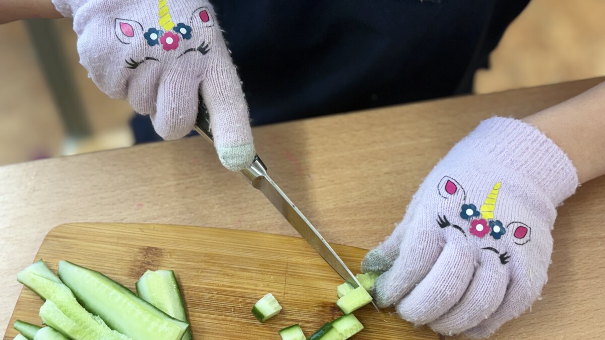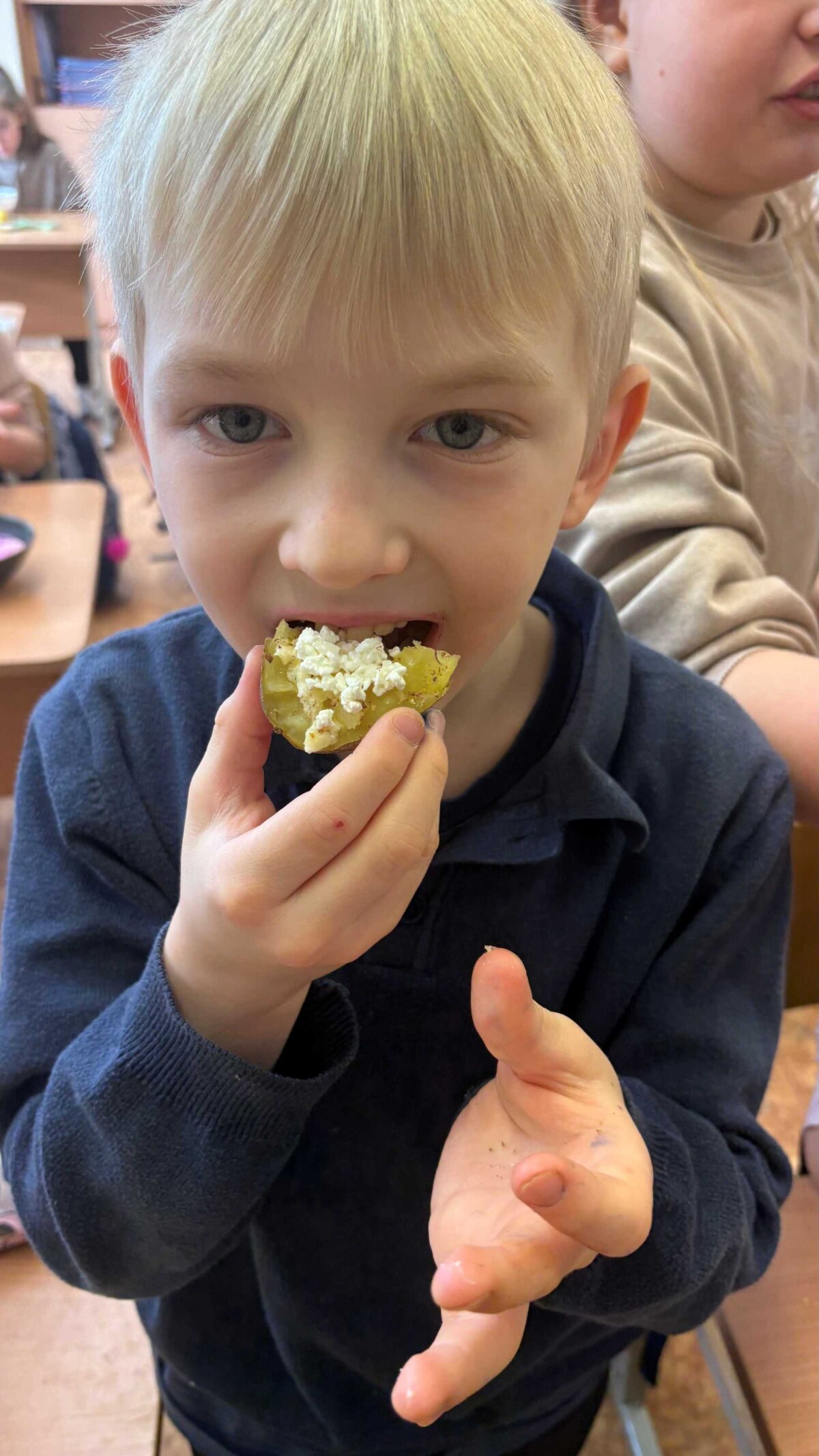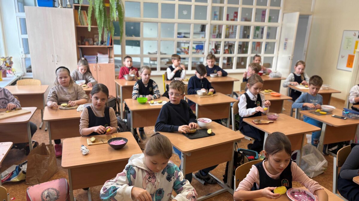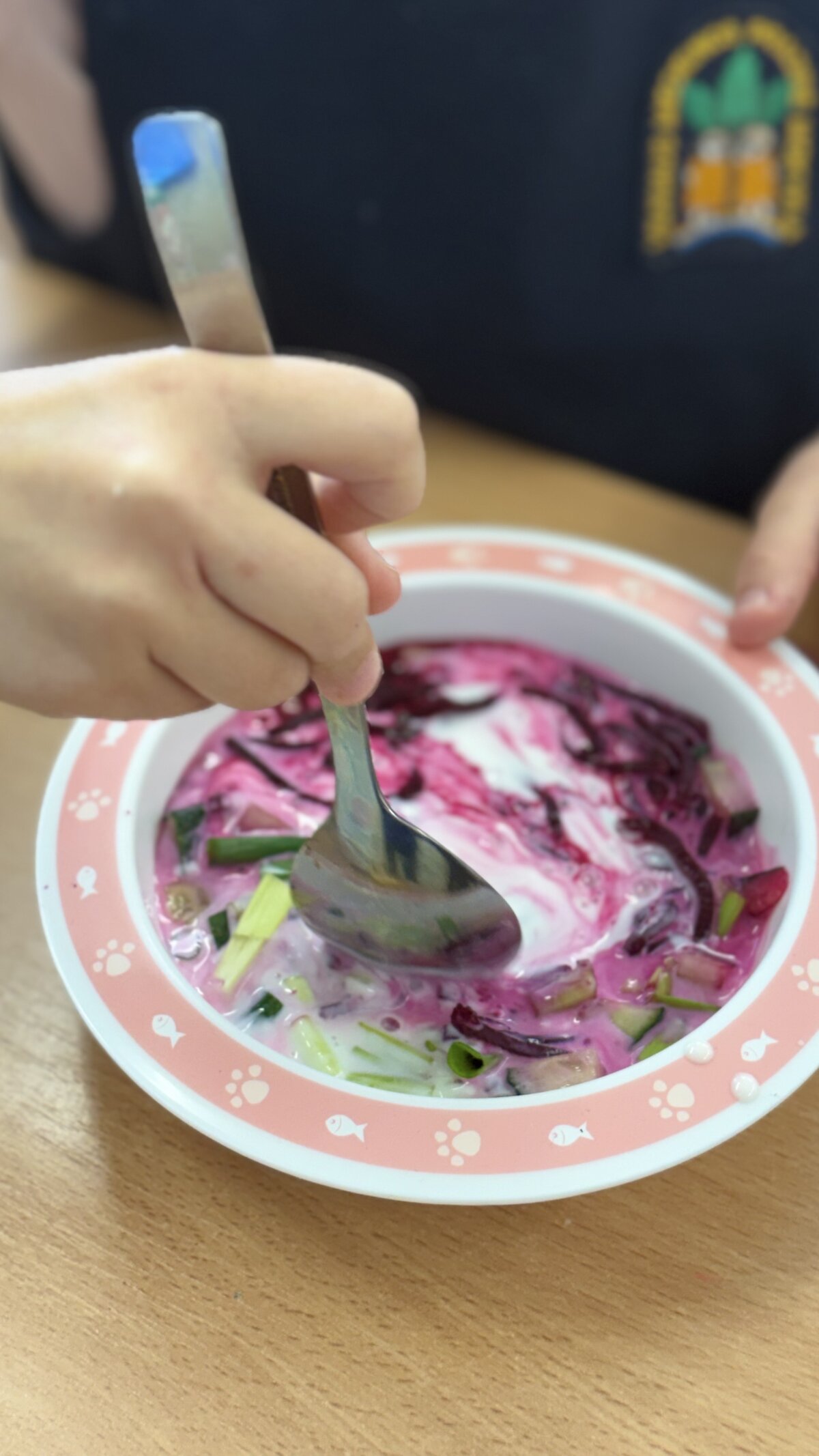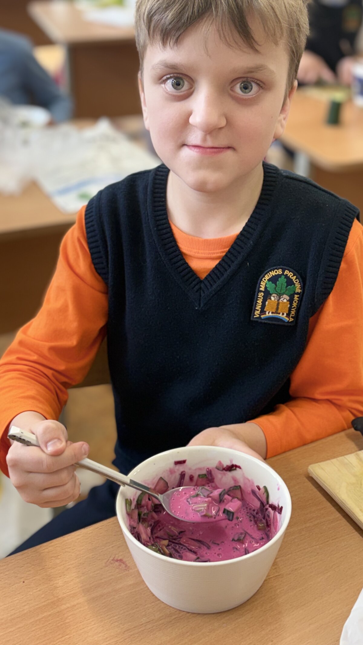 2a klasės mokiniai technologijų pamokoje mokėsi kubeliais supjaustyti agurką, gamino šaltibarščius, degustavo šiltą bulvę su varške, sviestu, bei linų sėmenų sėklomis. Pamoka buvo ne tik smagi, bet ir labai naudinga - mokiniai lavino praktinius įgūdžius, savarankiškumą bei sveikos mitybos įpročius.
