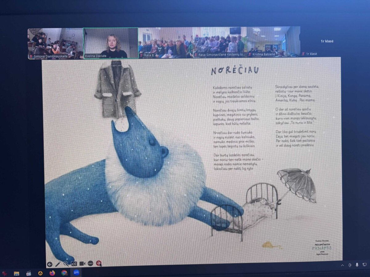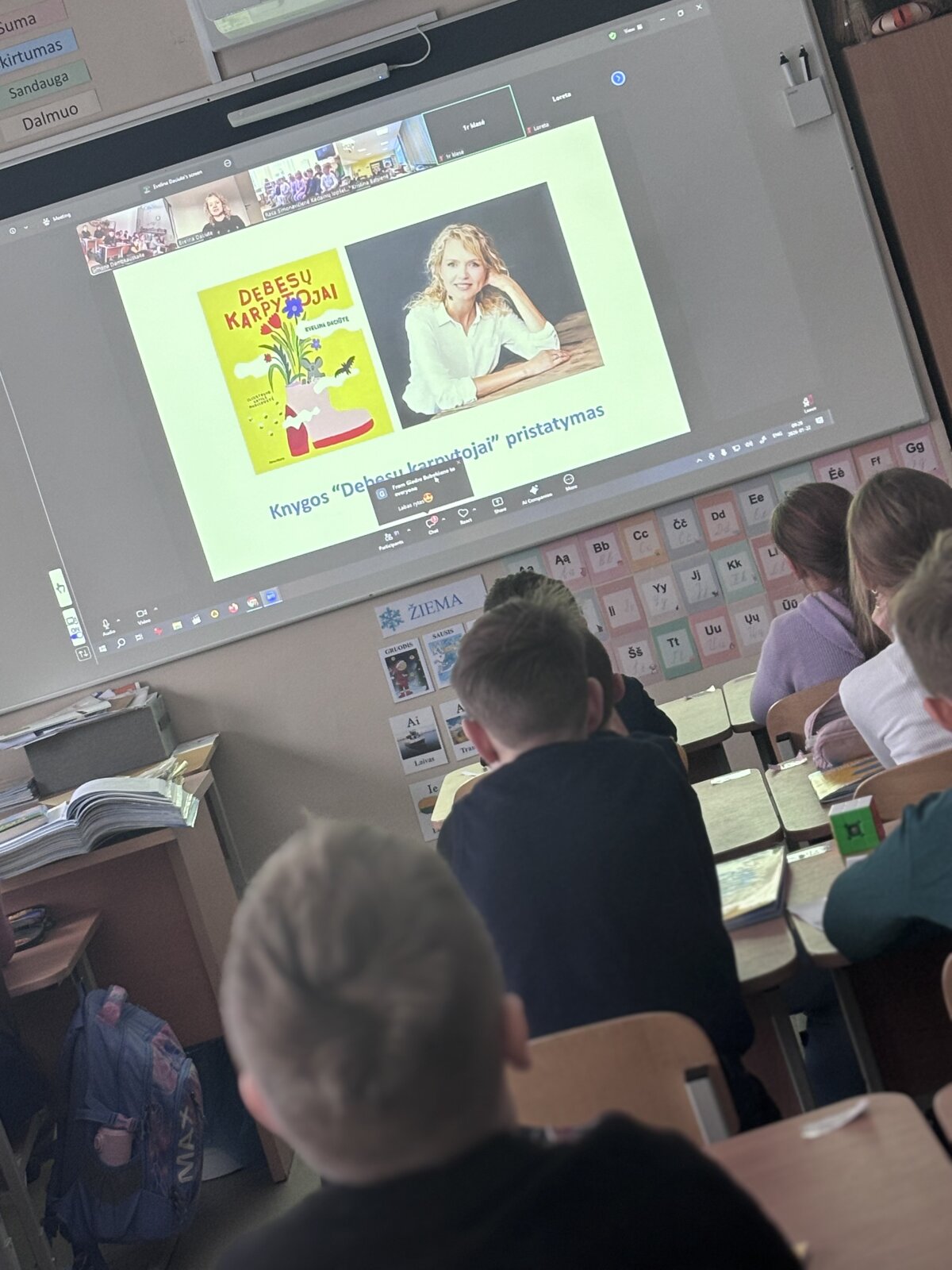 3b klasės mokiniai dalyvavo nuotoliniame susitikime su rašytoja Evelina Daciūte. Susitikimo metu autorė pristatė savo knygą „Debesų karpytojai“ ir pakvietė mokinius leistis į vaizduotės, jausmų bei kūrybos kupiną pasaulį. Rašytoja pasakojo apie savo kūrybą, apie knygos atsiradimą, veikėjus ir pagrindines temas. Mokiniai turėjo galimybę išgirsti, kaip pati autorė skaito jau žinomus ir mėgstamus eilėraščius. Šis susitikimas buvo įkvepianti patirtis, skatinanti domėtis literatūra, skaityti ir drąsiai svajoti. Mokiniai liko sužavėti nuoširdžiu bendravimu ir kūrybiška autorės asmenybe.