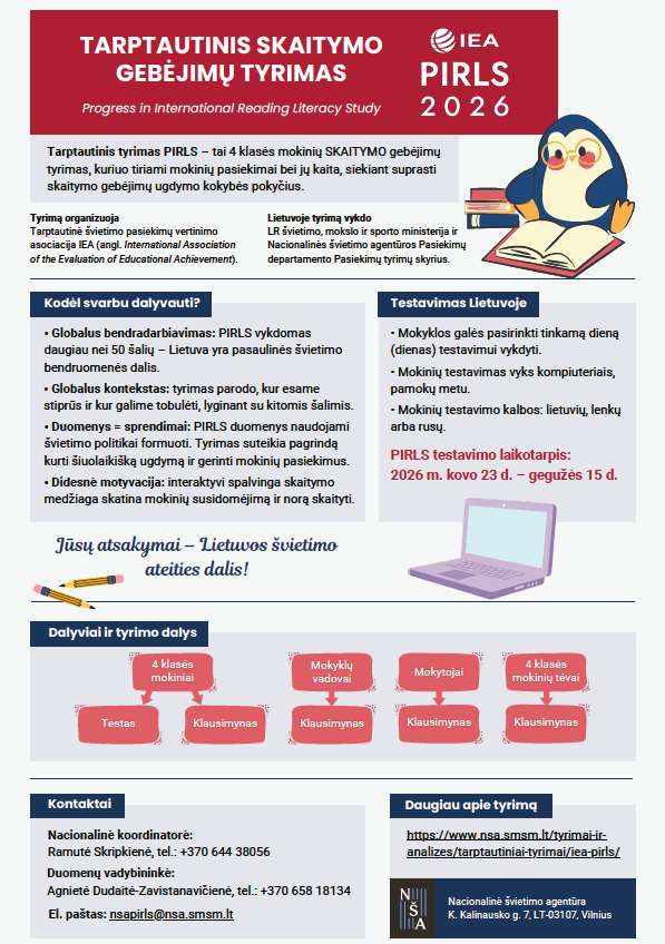2026 m. gegužės 5 d. Vilniaus Medeinos pradinėje mokykloje bus vykdomas tarptautinis skaitymo gebėjimų tyrimas PIRLS.