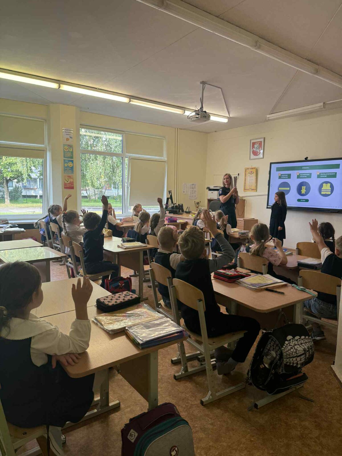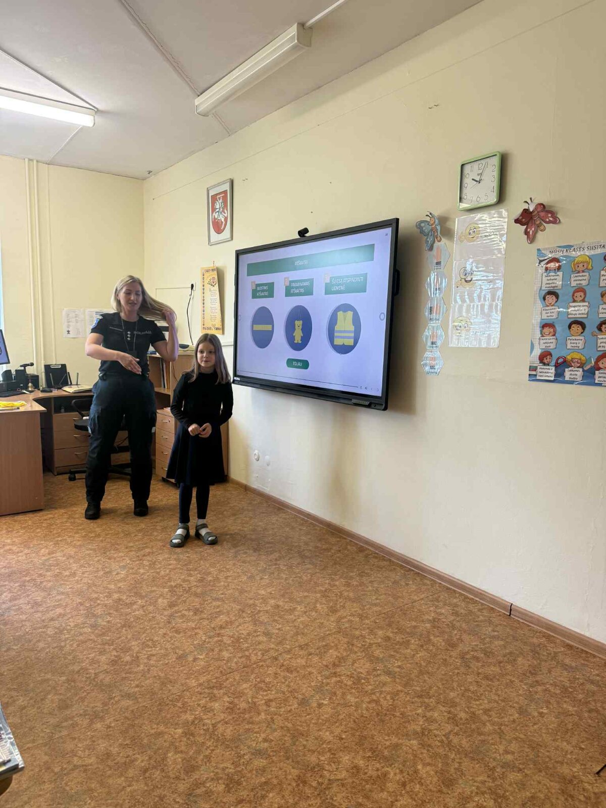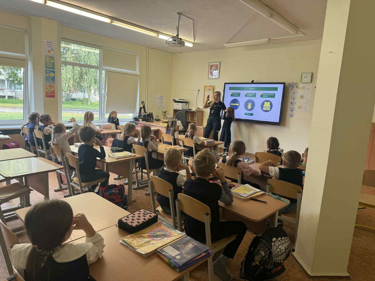 Rugsėjo 22 dieną mūsų mokyklos pirmokus aplankė Vilniaus m. 6-o policijos komisariato bendruomenės pareigūnė, kuri kartu su mokiniais kalbėjosi apie tai, kaip svarbu kelyje elgtis saugiai: kaip tinkamai pereiti gatvę, ką reiškia šviesoforo signalai, kodėl būtina segėti atšvaitus. Mokiniai klausėsi labai susidomėję, noriai atsakinėjo į klausimus ir dalijosi savo patirtimi.