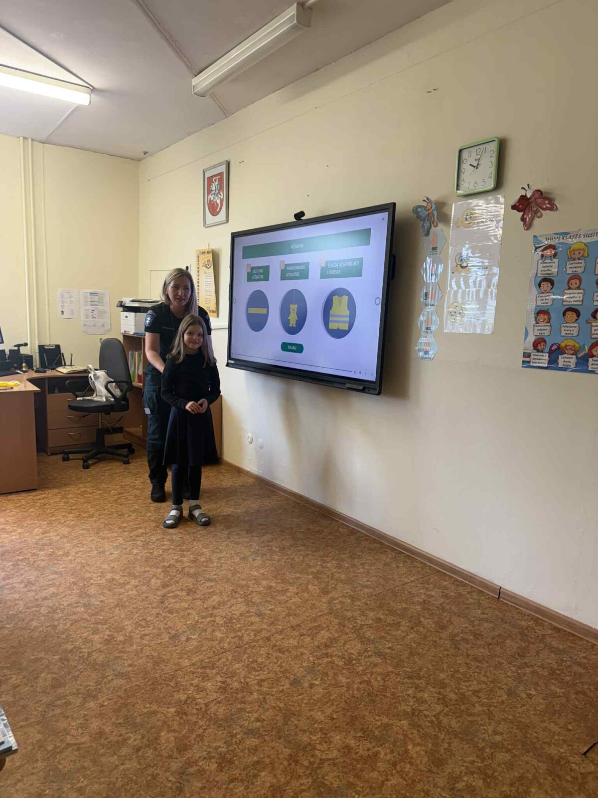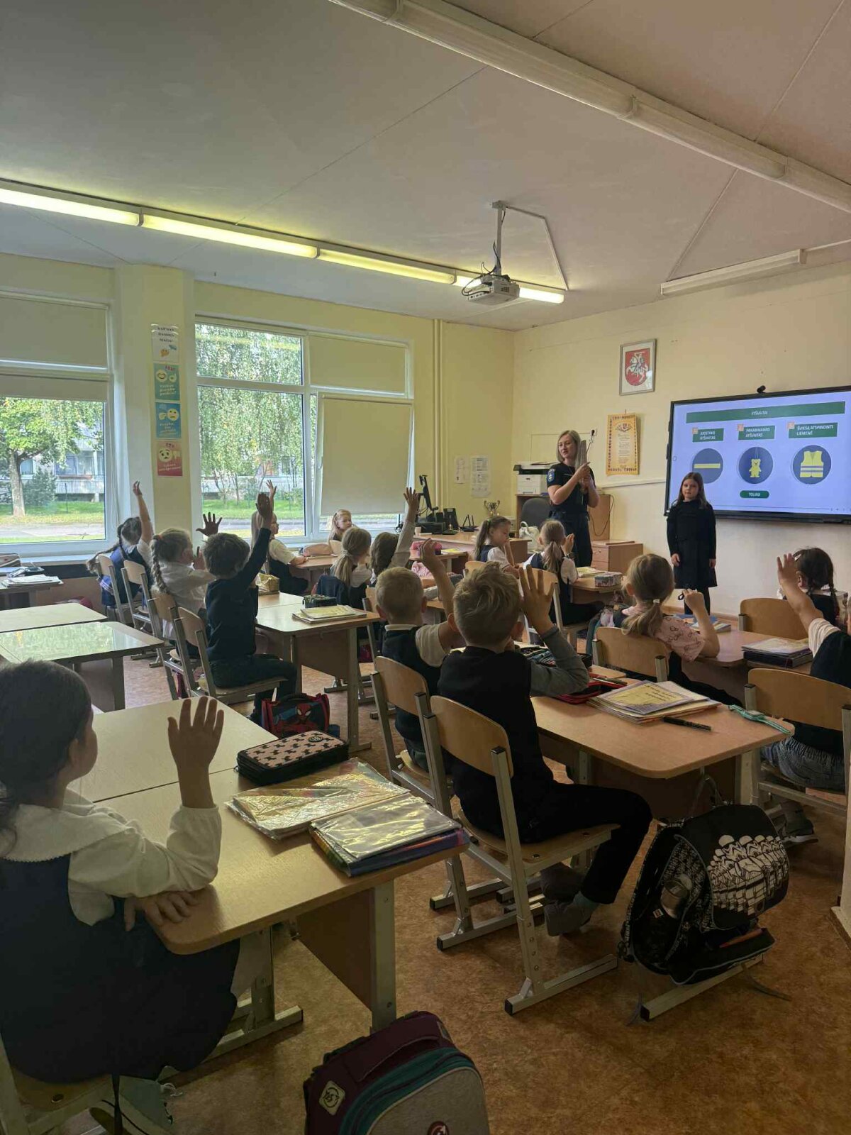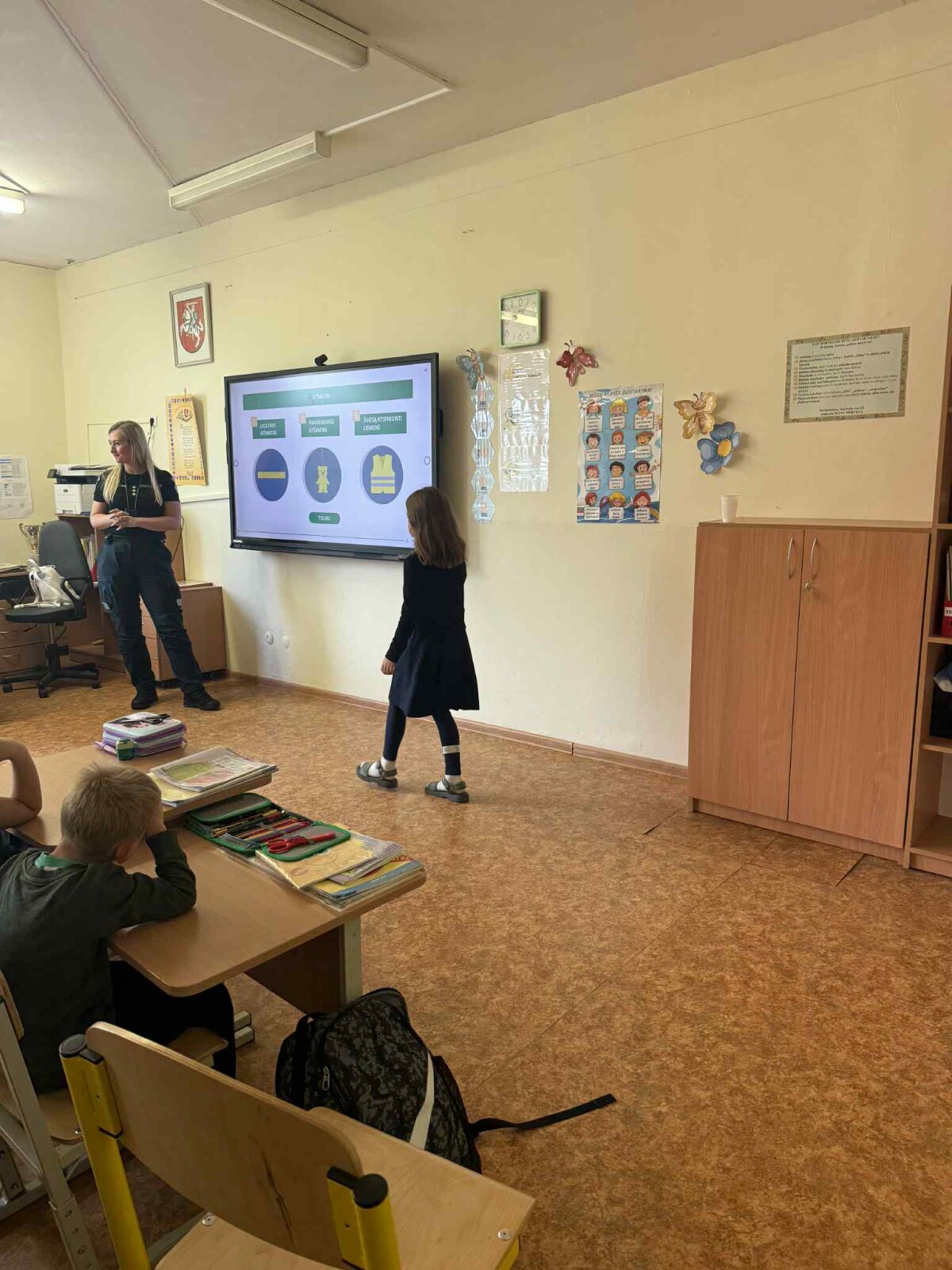 Rugsėjo 22 dieną mūsų mokyklos pirmokus aplankė Vilniaus m. 6-o policijos komisariato bendruomenės pareigūnė, kuri kartu su mokiniais kalbėjosi apie tai, kaip svarbu kelyje elgtis saugiai: kaip tinkamai pereiti gatvę, ką reiškia šviesoforo signalai, kodėl būtina segėti atšvaitus. Mokiniai klausėsi labai susidomėję, noriai atsakinėjo į klausimus ir dalijosi savo patirtimi.