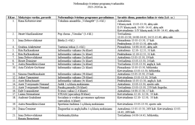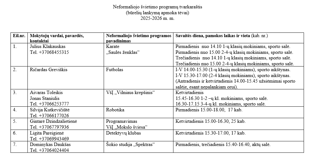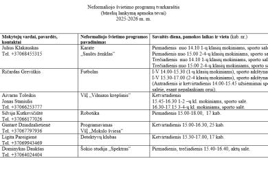 Neformalusis švietimas – tai savanoriškos veiklos po pamokų, kurios padeda vaikams stiprinti kūrybiškumą, bendravimą, atsakomybę ir kitas gyvenimui svarbias kompetencijas per muziką, sportą, technologijas, teatrą, gamtos tyrinėjimus ir panašias sritis. Šios veiklos papildo mokomuosius dalykus ir leidžia kiekvienam vaikui saugioje aplinkoje išbandyti save, atrasti stiprybes bei naujus pomėgius. Dalyvavimas neformaliajame švietime ugdo pasitikėjimą savimi, skatina bendruomeniškumą ir padeda auginti mokymosi motyvaciją.